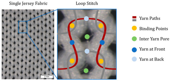 Single Jersey is a very common, simple, periodic knitting pattern. Figure 1 illustrates the key elements of knitted fabrics, which affect the wicking and drying behaviour: binding points where the yarns cross, inter-yarn pores between the yarns, and the yarn alternating between the upper and lower fabric surfaces.