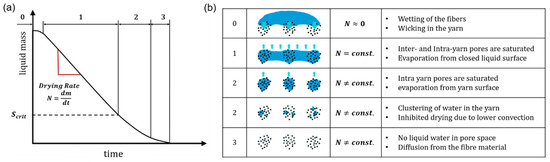 Figure 3. (a) Typical drying curve of porous media and (b) liquid in a yarn cross-section at different phases of drying. Black dots indicate fibers, blue arrows indicate liquid transport.