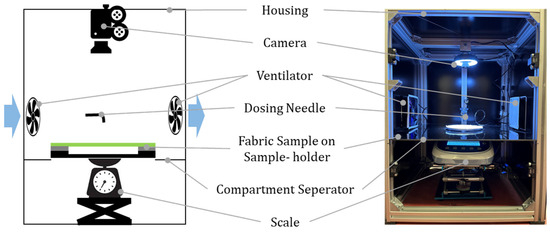 Figure 5. Experimental setup for combined wicking and drying. During the experiment, the housing was closed with a light-tight front door.