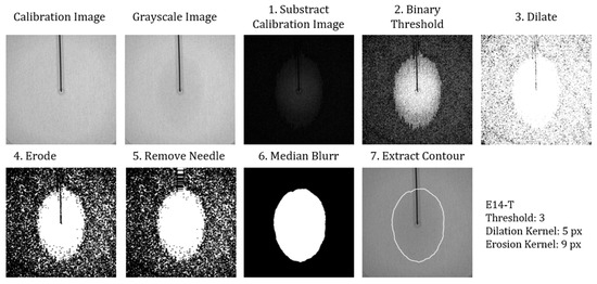 Before the dosing begins, a calibration image is taken, and the subsequent images are subtracted from it. As the contrast is not high enough to determine the liquid front, a threshold specific to the fabric is applied. White areas are then dilated and subsequently eroded using fabric-specific kernel sizes. The needle, which was previously extracted from the calibration image, is removed. A median blur filter is applied to remove residual noise. Finally, the contour of the liquid front can be extracted from the image. Details of the filtering functions can be found in the OpenCV documentation [35]. The parameters of the thresholding, dilation and erosion are fabric-specific because inter-yarn pores strongly influence the imaging.