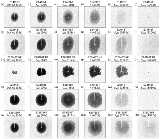 Figure 8. (ax) Images of non-textured yarns after the thresholding step. The weft direction is horizontal and the warp direction is vertical. Air flow direction is horizontal. The white areas around the nozzle are reflections of surface water. Side length of the images is 10 cm × 10 cm.