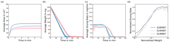 Figure 10. Experimental results on fabric E28f48T with (hydrophilic) and without plasma treatment (hydrophobic). (a) average spread area, (b) mean drying curve, (c) drying rate, (d) characteristic drying curve. Solid curves denote mean, shadows denote standard deviation of the measurements.