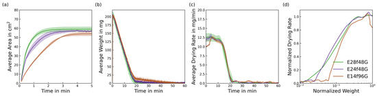 Figure 7. Calculation of drying and wicking properties from experimental data. (a) average spread area, (b) mean drying curve, (c) drying rate, (d) characteristic drying curve. Curve denotes mean, shadow denotes standard deviation of the measurements.