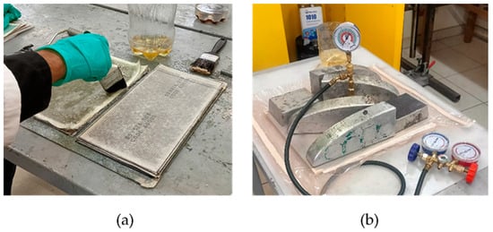 Hand lay-up: (a) assisted vacuum bagging with added weight and (b) the method used to manufacture the proposed laminates.