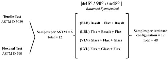 The laminate configurations were adapted from the design proposed by Song et al. [6], incorporating different stacking sequences of flax, basalt, and glass fibers to optimize mechanical performance. The configurations were as follows: