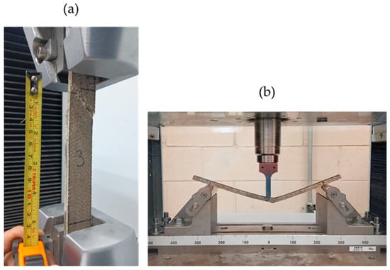 Six test specimens were tested under both tensile and flexural loading conditions. Tensile testing was conducted according to ASTM D3039 using a Universal Testing Machine from Physical Test Solutions (Physical Test Solutions, Culver City, CA, USA). (https://www.physicaltestsolutions.com/) (accessed on 4 April 2025) with PTS MaxTest software for controlling, testing, and data acquisition. Tensile tests were performed under a constant crosshead speed of 2 mm/min until specimen failure, as specified by ASTM D3039 (see Figure 3a).
