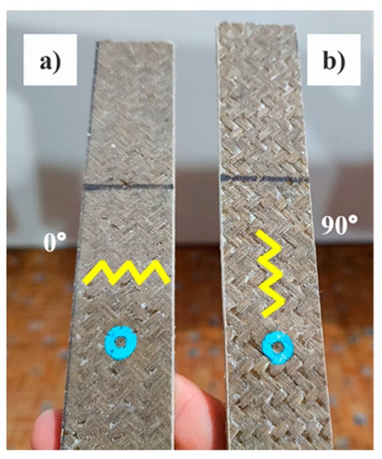 Following the statistical analysis of the tensile and flexural test results (see Section 3. Results and Discussion for more details), the LVL laminate configuration was identified as the best-performing laminate owing to its superior mechanical properties. To further characterize its orthotropic mechanical properties, the LVL laminate was remanufactured using the vacuum-assisted hand lay-up method described previously (as discussed in Section 2.3. Manufacturing Process). Because only a single-axis testing machine was available, an additional LVL laminate was produced with fiber orientations rotated by 90° to determine the transverse mechanical properties (see Figure 4).