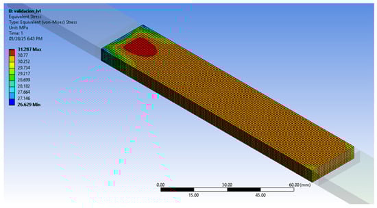FEA was performed under the same boundary and loading conditions as the experimental tensile test (see Section 2.4.1. Tensile and Flexural Testing of Hybrid Laminates) to ensure an accurate comparison between the numerical and physical results (Figure 5). The boundary conditions of one end face of the virtual test specimen were fully constrained to simulate the fixed grip of the testing machine, whereas a longitudinal tensile load was applied to the opposite end face, replicating the axial loading conditions used during the experimental procedure. The two mechanical parameters used for the validation were the average elastic limit in the calibrated area of the test specimen and the maximum longitudinal displacement of the central region (50 mm gauge length) of the calibrated section. The finite element model resulted in a stress of 30.427 MPa, which was compared to the experimental average of 30.69 MPa with an error of 0.86%. In contrast, the maximum longitudinal displacement obtained in the simulation was 0.032992 mm, resulting in a calculated strain of 0.0006598. A strain error of 5.25% was obtained compared to the experimentally measured strain of 0.0006269.