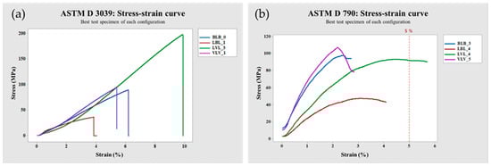 The LVL laminate exhibited the highest tensile strength (187.79 ± 8.02 MPa), while the VLV configuration achieved the highest flexural strength (109.94 ± 7.92 MPa), which was not significantly different from that of the LVL (91.31 ± 8.43). Notably, LVL reached a flexural strain exceeding 5% without failure, demonstrating a greater capacity for deformation prior to fracture. Overall, LVL showed a better mechanical response than the other configurations in terms of tensile and flexural performance. The stress–strain curves for all laminates, shown in Figure 6, highlight LVL’s load-bearing capacity and flexibility.