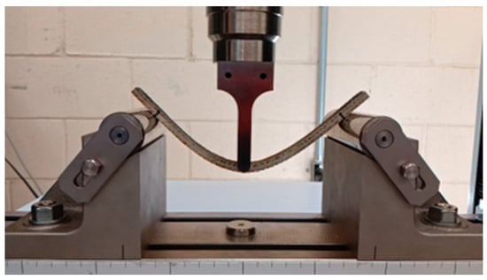 Flexural testing followed ASTM D790 standards using a SHIMADZU AG-IC 100 kN Universal Testing Machine (Shimadzu Corporation, Kyoto, Japan) (https://www.shimadzu.com/) (accessed on 4 April 2025) with TRAPEZIUM X software for control and data acquisition. Flexural tests were performed as three-point bending tests with a constant crosshead speed of 2 mm/min until specimen failure or 5% strain, whichever occurred first (see Figure 3b). The load and displacement data were captured for analysis, and the results were averaged from six specimens per laminate configuration for each test type for statistical reliability.