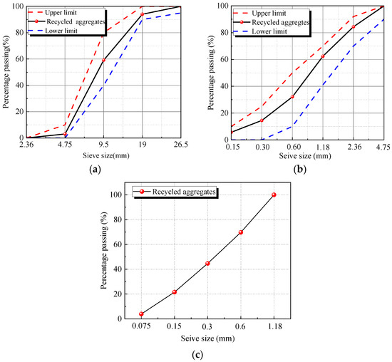 The gradation curves of the (a) 5–20 mm recycled aggregates, (b) 0–5 mm recycled aggregates, (c) 0–1.18 mm recycled aggregates.