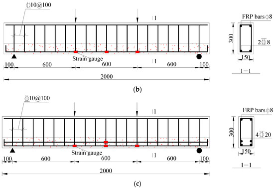 The dimensions and detailed reinforcement of the (a) balanced-reinforced beam, (b) Rare-reinforced beam, (c) Over-reinforced beam.