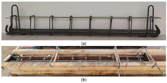 (a) Reinforcement cage, (b) Pouring formwork of for the beam.