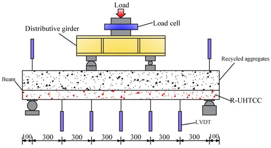 Based on the above research, it can be concluded that ECC-RC composite beams improve beam performance while simultaneously reducing project costs. Both normal concrete and ECC can use recycled aggregates to replace natural aggregates, thereby enhancing their sustainability. The use of fully recycled aggregates in composite beams holds significant ecological and economic value. However, there is currently no research on the flexural behavior of ECC-RC composite beams with fully recycled aggregates. Against this background, in this study, 10 composite beams made from ultra-high toughness cement-based composite (UHTCC) materials and recycled concrete were tested under bending load. The UHTCC made entirely from recycled fine aggregate (R-UHTCC), previously developed by the author team [41], was used in this program. The effects of concrete strength, R-UHTCC layer height, stirrup spacing in the constant moment region, and reinforcement ratio on the flexural performance of the R-UHTCC and composite beams—including failure mode, crack patterns, midspan deflection, stiffness, ductility, and load capacity—are analyzed. Additionally, a stiffness calculation method for the R-UHTCC and recycled concrete composite beams is proposed and validated experimentally. The highlight of this paper lies in the use of fully recycled aggregates in both concrete and UHTCC. The cooperative performance of R-UHTCC and recycled concrete was explored, and the suitable thickness of the R-UHTCC layer for composite beams was proposed. The research findings lay a foundation for the application of fully recycled aggregate concrete in engineering.
