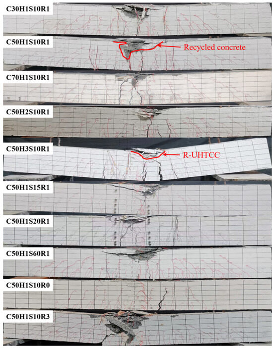 For rare-reinforced and over-reinforced composite beams, the failure modes were characterized by brittle failure. In the case of the rare-reinforced beam C50H1S10R0, failure did not occur immediately upon reaching the cracking load. Instead, multiple fine cracks developed in the constant moment zone and shear span of the beams. As the load increased, the width of the primary crack expanded rapidly. Upon reaching the ultimate load, the tensile reinforcement at the main crack ruptured. At this point, the main crack nearly penetrated the entire beam section, while the concrete in the compression zone remained intact. The rare-reinforced R-UHTCC and recycled concrete composite beam exhibited a brief load growth after cracking, although this process was relatively short-lived. In contrast, the destructive process of the over-reinforced composite beam C50H1S10R3 resembled that of a typical ordinary concrete over-reinforced beam. Upon reaching the ultimate bearing capacity, the compressed concrete suddenly crushed, resulting in a rapid loss of bearing capacity. At this stage, numerous fine cracks appeared in the tensile zone. The tensile reinforcement remained elastic, while the crushing depth of the concrete was significantly greater than that of the balanced-reinforced beam, indicating a brittle failure mode. Furthermore, for all test beams, nearly all cracks extended from the R-UHTCC layer to the recycled concrete layer, as shown in Figure 6, highlighting the strong bonding properties between the R-UHTCC and the recycled concrete.