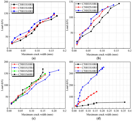 Load-maximum crack width curves of the beams: (a) Different concrete strength grades series; (b) Different R-UHTCC layer height series; (c) Different stirrup spacing series; (d) Different reinforcement ratios series.