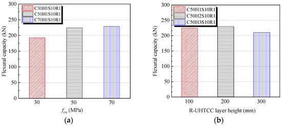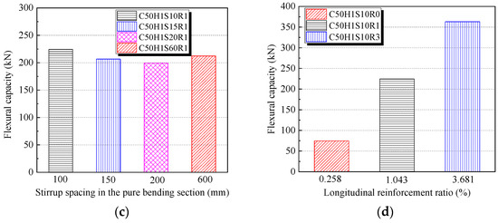 The flexural capacity of R-UHTCC and recycled concrete composite beams is presented in Figure 8. The flexural capacity increases with the concrete strength, as shown in Figure 8a. Compared to the C30 concrete-strength beam, the flexural capacities of the C50 and C70 concrete-strength beams increased by 16.5% and 18.8%, respectively. However, the height of the R-UHTCC layer showed minimal impact on the flexural capacity. For example, the beam with an R-UHTCC layer height of 200 mm exhibited only a 2.3% increase in flexural capacity compared to the beam with a 100 mm R-UHTCC layer. When the R-UHTCC was used across the entire beam section, the flexural capacity was the lowest. This can be explained by the fact that the flexural capacity of the composite beam is influenced not only by the concrete in the tensile zone and the longitudinal reinforcement but also by the concrete in the compression zone. While the high tensile strength and toughness of R-UHTCC improve the flexural capacity in the tensile zone, these properties cannot be fully utilized in the compression zone. Furthermore, the elastic modulus of R-UHTCC is considerably lower compared to the recycled concrete used in this study, leading to lower compressive stress in the compression zone of the beam. As a result, the flexural capacity of the full-section R-UHTCC beam is lower than that of composite beams that incorporate R-UHTCC only in the tensile zone. Therefore, for engineering applications, it is recommended to use R-UHTCC in the tensile zone of recycled concrete beams. It can be seen from Figure 8c that the flexural capacity also shows a decreasing trend with increasing stirrup spacing in the pure bending section. Specifically, the flexural capacities of the beams with stirrup spacings in the pure bending section of 150 mm, 200 mm, and no stirrups decreased by 7.9%, 11.2%, and 5.4%, respectively, compared to the beam with a 100 mm stirrup spacing. Furthermore, the flexural capacity improves significantly with the increase in reinforcement ratio, as shown in Figure 8d. Compared to the beam with a longitudinal reinforcement ratio of 0.258%, the flexural capacities of the beams with reinforcement ratios of 1.043% and 3.68% increased by 27.3% and 64.6%, respectively. The standard deviations and coefficients of variation of the flexural capacity for each series of beams were also calculated in this paper. The standard deviations and coefficients of variation of the flexural capacity were 16.13 and 0.075 for the different concrete strength grade series, 8.03 and 0.036 for the different R-UHTCC layer height series, 9.17 and 0.044 for the different stirrup spacing series, and 117.85 and 0.534 for the different longitudinal reinforcement ratio series. This indicates that the longitudinal reinforcement ratio has the most significant influence on the flexural capacity of the composite beams, followed by concrete strength. The influence of R-UHTCC layer height and stirrup spacing is relatively small. This phenomenon should be considered in the bearing capacity design of the composite beams.