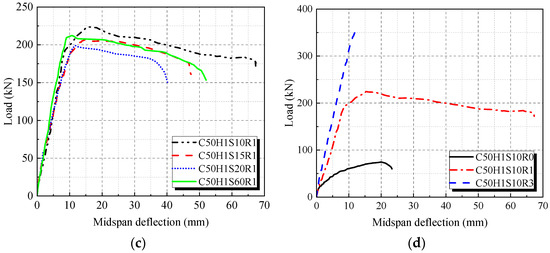 Load-deflection curves of beams: (a) Different concrete strength grades series; (b) Different R-UHTCC layer heights series; (c) Different stirrup spacings series; (d) Different longitudinal reinforcement ratios.