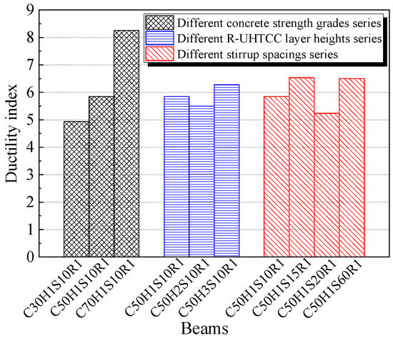 The ductility index of the balanced-reinforced composite beams is presented in Figure 10. As shown, the ductility index of all beams exceeds four. For normal RC flexural beams, the experimental values of the deflection ductility factor generally range from two to six [46]. Therefore, it can be concluded that the R-UHTCC and recycled concrete composite beams exhibited excellent ductility. Additionally, the ductility index increases with the concrete strength grade. Specifically, compared to the beam with a concrete strength grade of C30, the ductility index of the beams with C50 and C70 concrete strength grades increased by 18.5% and 67.3%, respectively. The ultimate tensile strain also increases with the R-UHTCC strength [44], indicating that higher R-UHTCC strength enhances the ductility of the composite beams. However, the ductility index of the beam with the full-section R-UHTCC was only 7.2% greater than that of the beam with a 100 mm R-UHTCC layer height, suggesting that good ductility can be achieved using R-UHTCC only within a certain height range in the tensile zone of the beam. Furthermore, it can be seen from Figure 10 that the effect of stirrup spacing on beam ductility was inconsistent, probably because of the variability in the experimental results. The standard deviations and coefficients of variation of the ductility were 1.4 and 0.221 for the different concrete strength grade series, 0.32 and 0.054 for the different R-UHTCC layer height series, and 0.53 and 0.088 for the different stirrup spacing series. This indicates that the concrete strength has the most significant influence on the ductility of the composite beams, while the R-UHTCC layer height has minimal impact on the beam’s ductility.