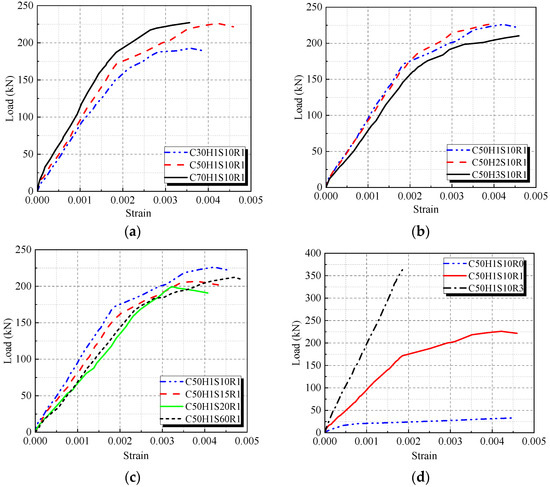 Load-strain curves of beams: (a) Different concrete strength grades series; (b) Different R-UHTCC layer heights series; (c) Different stirrup spacings series; (d) Different longitudinal reinforcement ratios.
