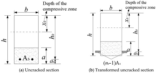 where b and h refer to the width and height of the beam section, respectively; x0 is the depth of the compressive zone for the uncracked section; a is the R-UHTCC layer height; ns is the elastic modulus ratio of the tensile reinforcement to the recycled concrete; nr is the elastic modulus ratio of the R-UHTCC to the recycled concrete; h0 is the effective height of the beam.