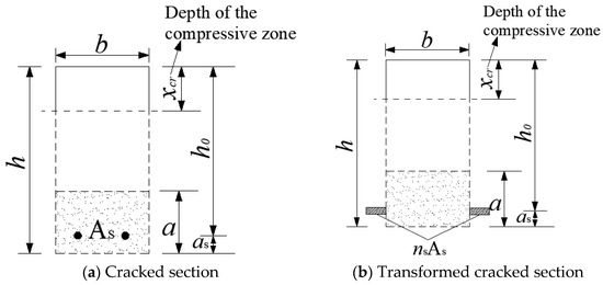 Figure 13 illustrates the transformation diagram of the cracked section for the composite beam. For normal RC beams, the concrete’s contribution to the moment of inertia in the tensile zone is neglected after cracking. According to the equal area moment of the neutral axis in the tensile and compressive zones, the depth of the compressive zone and moment of inertia for the cracked section of the normal RC beam can be calculated as follows: