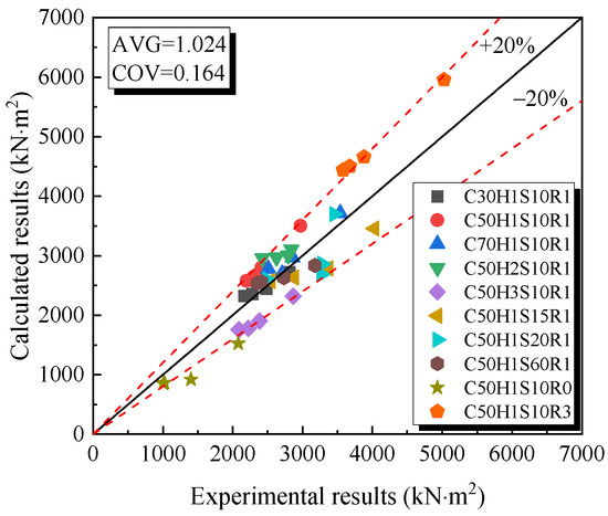 Substituting the midspan deflection test results of the 10 composite beams in this experiment into Equation (11), the experimental stiffness of the beams under normal service conditions can be obtained. Figure 14 presents a comparison between the calculated and experimental stiffness values based on Equation (9) for beams subjected to different loads. The average ratio of experimental to calculated results is 1.024, accompanied by a coefficient of variation of 0.164, indicating that the calculated values align well with the experimental results.