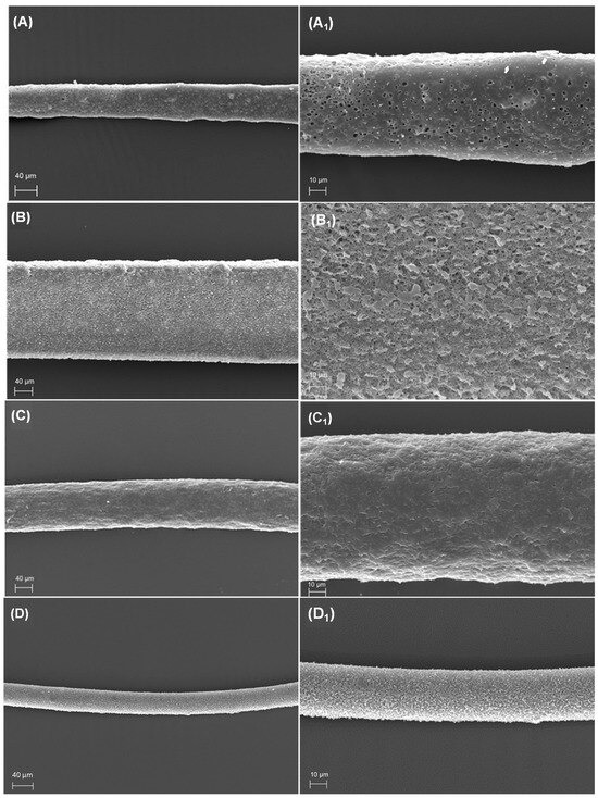 SEM micrographs and fibre diameters are presented in Figure 1. High-magnification micrographs of the produced fibres reveal distinct morphological and shape differences. A spongy morphology was observed exclusively in neat PHBHHx fibres (Figure 1A). This morphological characteristic in PHBHHx wet-spun fibres was previously reported by Puppi et al. [37] and Mota et al. [46]. This effect has been attributed to solvent/non-solvent counter-diffusion during polymer solution coagulation, leading to phase separation into polymer-rich and a polymer-poor phases [25,43,46]. The spongy effects have been identified as beneficial features, as they positively influence the biodegradation rate [37].