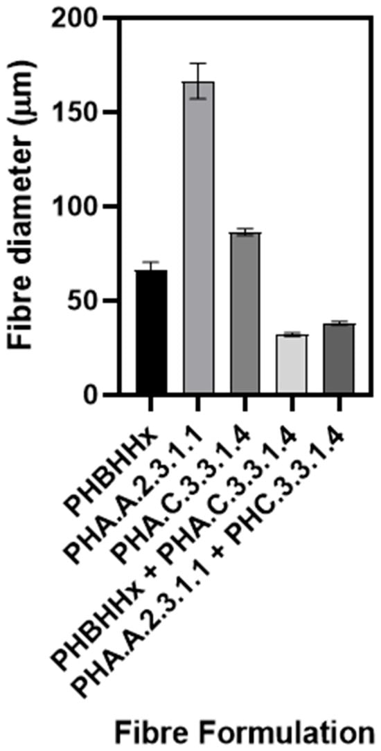 Neat PHA.A.2.3.1.1 (Figure 1B) and PHA.C.3.3.1.4 (Figure 1C) fibres, despite showing some surface irregularities and not being entirely smooth, did not exhibit polymer-poor phases like the spongy effect observed in neat PHBHHx fibres. Among the individual fibres, the neat PHA.C.3.3.1.4 fibres exhibited a more uniform and rounded geometry. The average fibre diameters, summarised in Figure 2, were determined by randomly measuring 50 points on each fibre. The calculated average diameters for neat PHBHHx, PHA.A.2.3.1.1, and PHA.C.3.3.1.4 fibres were 65.54 ± 7.34 μm, 164.98 ± 18.12 μm, and 84.88 ± 11.05 µm, respectively. As shown, the fibres produced from the commercial polymer PHBHHx exhibited the smallest diameters. Similar diameter values for PHBHHx fibres, ranging between 47 and 76 μm, were also reported by Puppi et al. and Mota et al. [34,43]. Among both PHA.C.3.3.1.4 and PHA.A.2.3.1.1 fibres, the former also exhibited smaller diameters (Figure 2).