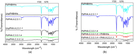 ATR-FTIR characterisation of the PHAs, between unprocessed and PHA fibres (a) and between only the fibres produced (b).