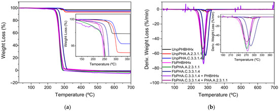 In this context, Figure 4a,b display the TGA and DTG thermograms, respectively, of the unprocessed polymers (UnpPHAs) and the produced fibres (FbPHAs). Table 3 presents the main degradation events of TGA, as well as glass transition temperature (Tg), melting temperature (Tm), and level crystallinity (Xc) from the second heating scans.
