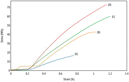 Examples of stress–strain curves of (a) neat epoxy; (b) 10 vol% kenaf fiber composite; (c) 20 vol% kenaf fiber composite; and (d) 30 vol% kenaf fiber composite.