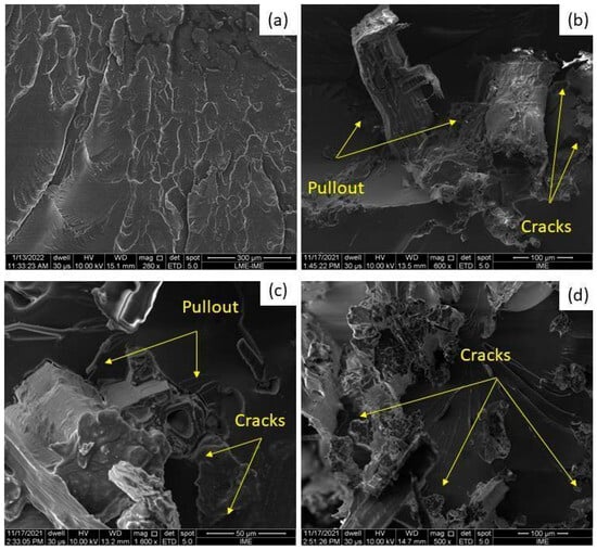SEM images of the fractured surfaces of tensile test specimens: (a) EPOXY; (b) EK10; (c) EK20; (d) EK30.