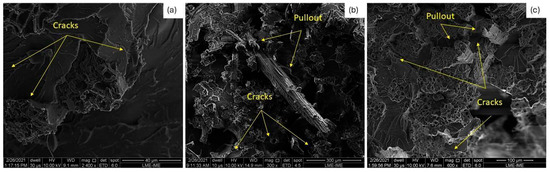 SEM fractographs of typical Izod impact specimens: (a) EK10; (b) EK20; (c) EK30.