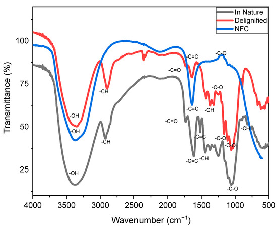 Cellulose nanofibrils underwent a more severe process, and it is evident that the NFC obtained has a spectrum similar to that of amorphous cellulose, with some bands disappearing. From the 2922 cm−1 bands of the raw sample and the 2899 cm−1 bands of the delignified sample, the -CH functional groups can be seen, whereas in the nanofibrillated sample these groups were absent.