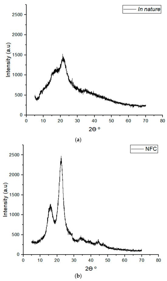 The amorphous lignocellulosic fiber underwent a chemical treatment to promote the depolymerization and solubilization of lignin and the hydrolysis of the highly branched hemicellulose content to reveal the cellulose and increase its accessibility to subsequent processes. The degradation of lignin and hemicellulose alters the degree of polymerization of all the components of the fiber, which leads to physical alterations in the surface, porosity and crystallinity, the latter being one of the most relevant due to the removal of amorphous regions, and the degree of crystallinity increases significantly [27,28]. The C.I. increased from 30% in the in natura sample to 49% in the NFC (Table 2). The lower C.I. value suggests that there was a large amorphous region initially and that these regions were removed after the chemical stages; subsequently, after mechanical treatment, there was a considerable increase. So, after the delignification process, the sample showed the presence of two peaks of greater intensity and definition, in contrast to the first sample in natura, the first being in the region of 16.2° and the second suffering a slight shift to 22° (see Figure 2b, delignified fiber).