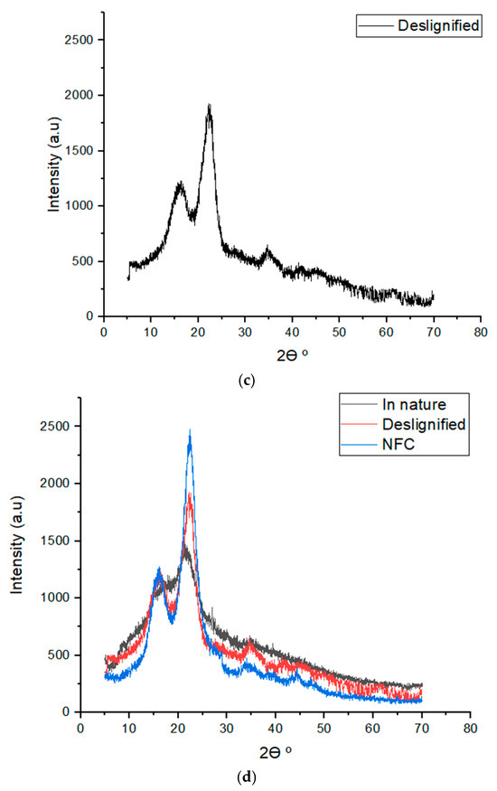 In the diffractogram for NFC in Figure 2c, we can see the result of the bleaching treatments that removed the lignin and hemicellulose fraction from the fibers and how the mechanical treatment can organize a periodicity over long distances in an orderly fashion, which reflects in a greater incidence the narrower and more intense crystalline peaks.