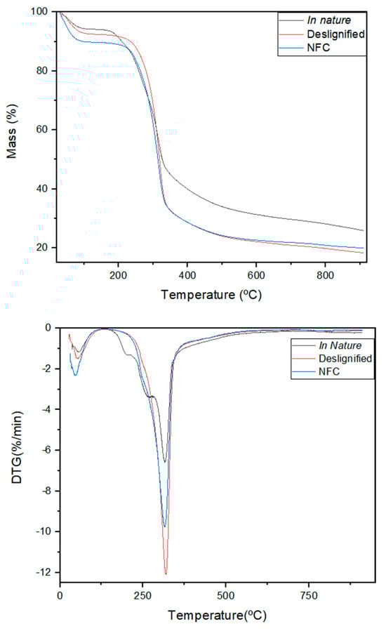 The Thermogravimetric curves (TGs) and their respective derivatives (DTGs) of the samples of raw fiber, delignified fiber and cellulose nanofibrils (NFCs) are shown in Figure 3, showing the thermal behavior of the materials in the face of decomposition. Thermogravimetric analysis makes it possible to indirectly assess the occurrence of mercerization as well as the efficiency of the pre-treatments applied to remove lignin and hemicellulose. In addition, it is possible to observe the thermal degradation profile of NFCs obtained through mechanical treatment after delignification. The data obtained provides evidence for understanding the thermal performance of the samples based on the variation in mass as a function of temperature and the heating rate applied.