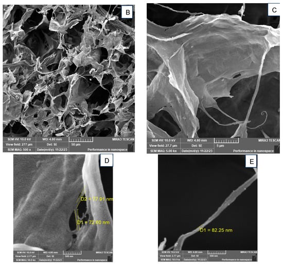 The micrographs follow a sequence of magnifications. In the first image (A), obtained using an SEM TM4000PLUS II (DPUNION), no metallization was required, and a large number of well-defined fibers can be observed. Image (B), as well as the subsequent ones, underwent metallization and were acquired with a MIRA3 LMH (TESCAN) microscope. In this case, the fibrils appear as an entangled web, and their visualization is less clear due to the metallization layer that tends to mask their individuality.