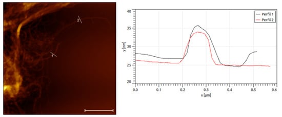 The AFM shows the morphology of the fibers after the mechanochemical treatment, as seen in Figure 5. Due to the convolution effect of the tip, the measurement of the width of the fibers may present values greater than the real ones for a more assertive value, so the height was used. The auxiliary graph in Figure 5 illustrates the measurement of the cut of the fibers, where it can be seen that their height is 8 ± 2 nm, confirming their nanometric dimension; it can also be seen that the fibers have a micrometric length. The bars and scale are meant to show the magnification for the cropped section of the whole fibrillated nanocellulose.