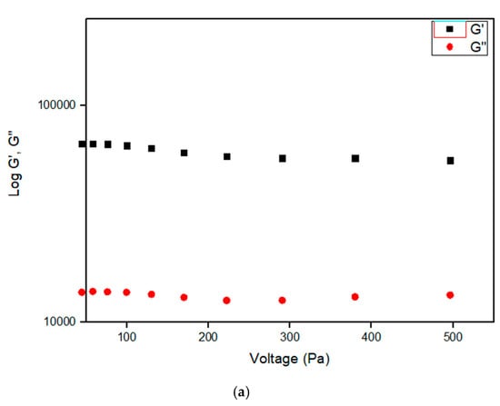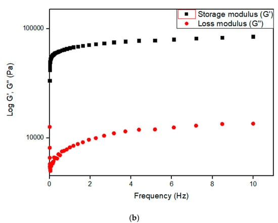 The results of the graph in Figure 6a, referring to the stress scan aimed at determining the linear viscoelastic region (LVR), show that the storage modulus (G’) remained constant, while the loss modulus (G”) showed little variation. The fact that G’ is significantly higher than G” over the entire stress range indicates that the sample exhibits a mostly elastic behavior, as observed in concentrated nanocellulose suspensions [37,38]. This behavior is associated with nanofibrillated suspensions, with strong hydrogen bonds and interlacing between fibrils, which gives a very resistant network formation [15,39].