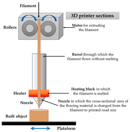 During the FDM process (Figure 1), a thermoplastic polymer filament is continuously fed into the extruder, where it is heated beyond its glass transition or melting temperature, allowing for controlled layer-by-layer deposition to form the desired structure [13].