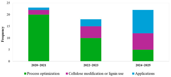 Earlier research emphasized fillers, printing conditions, and the nature of lignocellulosic fibers. In contrast, recent studies increasingly targeted end-use applications, with growing interest in fiber modification and lignin integration strategies (Figure 2).