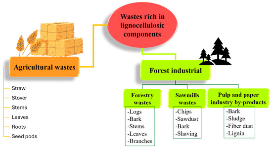 Gross classification of agro/forest industrial byproducts is shown in Figure 3. The classification is quite broad and includes byproducts rich in lignocellulosic components, proteins, lipids, or bioactive components. The categories labeled “Agricultural Wastes” and “Forest Industry” predominantly comprise lignocellulosic byproducts. These materials, which include straw, stover, stems, and leaves generated during harvesting and subsequent handling processes, represent significant sources of structural biopolymers such as cellulose, hemicellulose, and lignin.