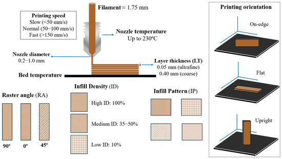 Then, the material is extruded through a nozzle onto the build platform horizontally in an x-y plane following the designated pattern [8]. The structure is completed layer by layer, and the build platform moves in the z plane, allowing the next layer to be deposited. In some cases, heating the build platform may be required to enhance the adhesion of the first printed layer [14]. Some FDM printers also possess multiple extrusion nozzles, allowing the simultaneous use of different printing and support materials [13]. Several parameters, including filament material and operational and environmental conditions, affect the FDM process [13,15,16]. These parameters then influence the final properties of the 3D-printed structures.
