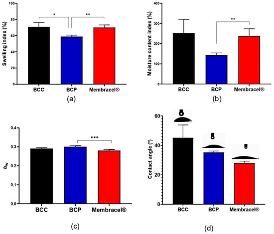 2.2.5. Water Interaction: Swelling Index, Moisture Content Index, Water Activity (aw) and Contact Angle