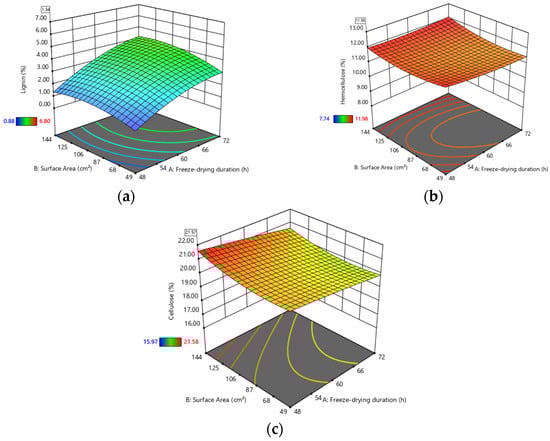 3D plots of responses as a function of freeze-drying duration and sample surface area for (a) lignin, (b) hemicellulose and (c) cellulose.