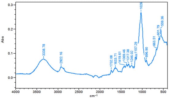 For cellulose, the bands at 3338.78 cm−1 and 2922.16 cm−1 are attributed to O-H and C-H stretching vibrations, respectively. Additionally, the bands at 1157.29 cm−1, 1026 cm−1, and 896.9 cm−1 can be assigned to C-O-C stretching and glycosidic bond vibrations in cellulose. Furthermore, the band at 1419.61 cm−1 corresponds to CH2 scissoring vibrations, while the band at 1369.46 cm−1 is associated with aliphatic C-H bending.