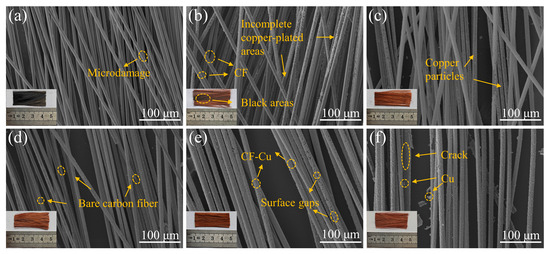 Incomplete copper deposition predominantly occurs within the core regions of CF bundles during electroplating [35]. Confocal micrographs in the inset of Figure 1 reveal distinct dark regions matching uncoated CF cores in specimens prepared without NaH2PO2, with such darkening mitigated upon introduction of this additive. As shown in Figure 1, SEM analysis was performed to systematically characterize the morphological evolution of CFs subjected to graded NaH2PO2 concentrations. Figure 1a presents the surface morphology of pretreated CFs, revealing an absence of structural defects, which confirms that the oxidative pretreatment preserved CF integrity while retaining their original mechanical performance characteristics [36]. Figure 1b–f shows a progressive morphological transition at the core regions of fiber bundles, corresponding to increasing NaH2PO2 concentrations, with improved copper deposition integrity and decreasing fractions of uncoated fibers as the reagent concentration increases. In the low-concentration regime (0–5 g/L, Figure 1b,c), copper nucleation appeared as discrete particulate deposits on fiber surfaces, failing to form continuous metallic coatings. In the transition regime (10–20 g/L, Figure 1d,e), incomplete copper coverage persisted, with localized coating discontinuities exposing the underlying CF substrates. At high concentrations (30 g/L, Figure 1f), although complete copper encapsulation was attained, residual particulate depositions persisted near the CF-Cu interface. Subsequent sedimentation analysis of electroplating baths revealed substantial accumulation of copper particulates, particularly pronounced in electrolytes with high NaH2PO2 concentrations. This observation implies the presence of residual metallic particulates in the electrolyte phase, which may trigger spontaneous agglomeration cascades that compromise bath stability.
