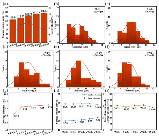 Basic parameters of CF-Cu and plating solution under different concentrations of NaH2PO2: (a) variation of copper loading; (b–f) diameter distribution; (g) variation in average diameter; (h) surface tension and ionic strength; (i) current efficiency.